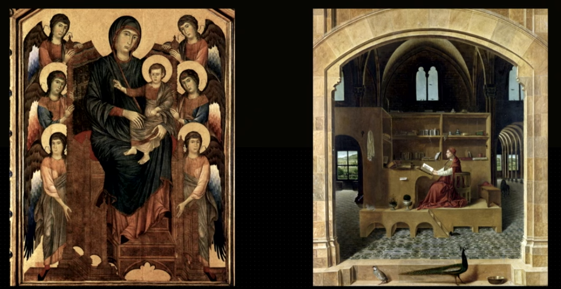 Essa tecnologia se tornaria amplamente aceita em toda a Europa e remodelaria a arte e a arquitetura, como você pode ver nas duas pinturas abaixo, que foram feitas com cerca de 150 anos de diferença. Mas ela também fez algo mais fundamental. Gradualmente, passou a ser aceito que essa era a forma real das coisas.