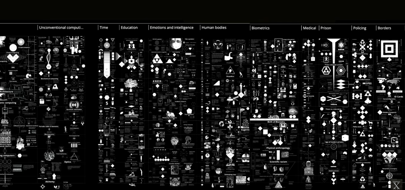 Com certeza. Quero dizer, Calculating Empires, que é, obviamente, a tela para a palestra desta noite, foi lançado em 2023 e tem feito uma turnê pelo mundo, e temos, você sabe, nossa próxima instalação na qual estamos trabalhando no momento. E o tipo de arte que faço, como você pode ver, é muito baseado em pesquisa.