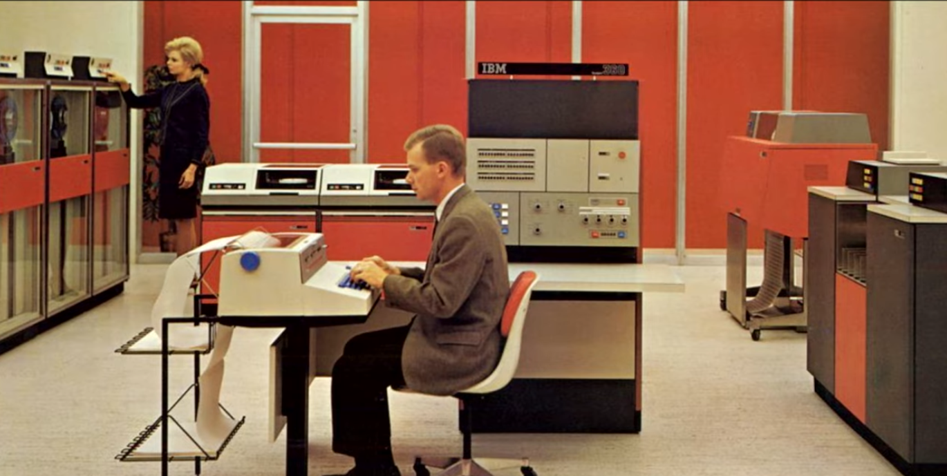 Portanto, para entender como chegamos aqui, a este ponto de volumes superdimensionados de dados de IA, precisamos voltar ao início de tudo. Muito atrás. A imagem a seguir mostra é o Laboratório de Reconhecimento de Fala Computacional da IBM no início dos anos 1970. Nessa época, os sistemas especialistas estavam em alta na IA. Isso significava modelar a compreensão da linguagem humana e ensinar aos computadores sistemas baseados em regras para gramática e características linguísticas. discursos. Mas esse laboratório em particular rejeitou o foco no conhecimento especializado centrado no ser humano e começou a usar métodos estatísticos de força bruta para analisar a frequência com que as palavras aparecem ao lado de outras palavras.