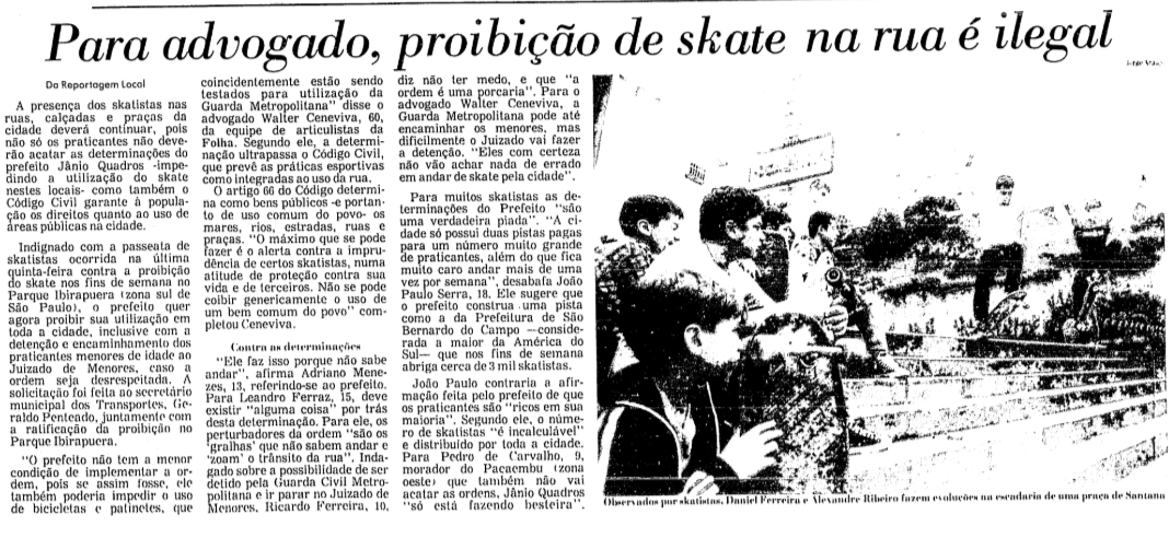 FOLHA, acervo digital. Para advogado, proibição de skate na rua é ilegal. São Paulo: 1988.Disponível em https://acervo.folha.com.br/digital/leitor.do?numero=10276&anchor=4296948&origem=busca&originURL=&maxTouch=0&pd=dc71ce477bb3ed165fd4fc55e58fb99b. Acesso em 20 dez. 2025.
