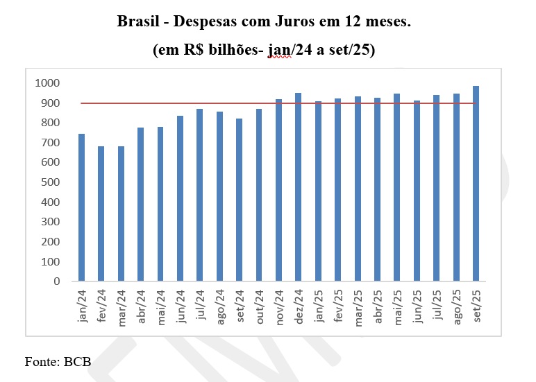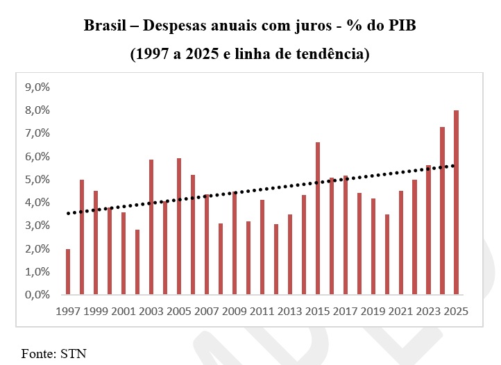 É urgente a mudança nas definições legais e institucionais que permitem este absurdo. Afinal, os números são realmente alarmantes. Desde que a série elaborada pela Secretaria do Tesouro Nacional (STN) começou a coletar as informações estatísticas a esse respeito, o comprometimento do orçamento para pagamento de juros só fez crescer. De janeiro de 1997 a setembro de 2025, esse montante chegou a R$ 11,5 trilhões, a valores atualizados.
