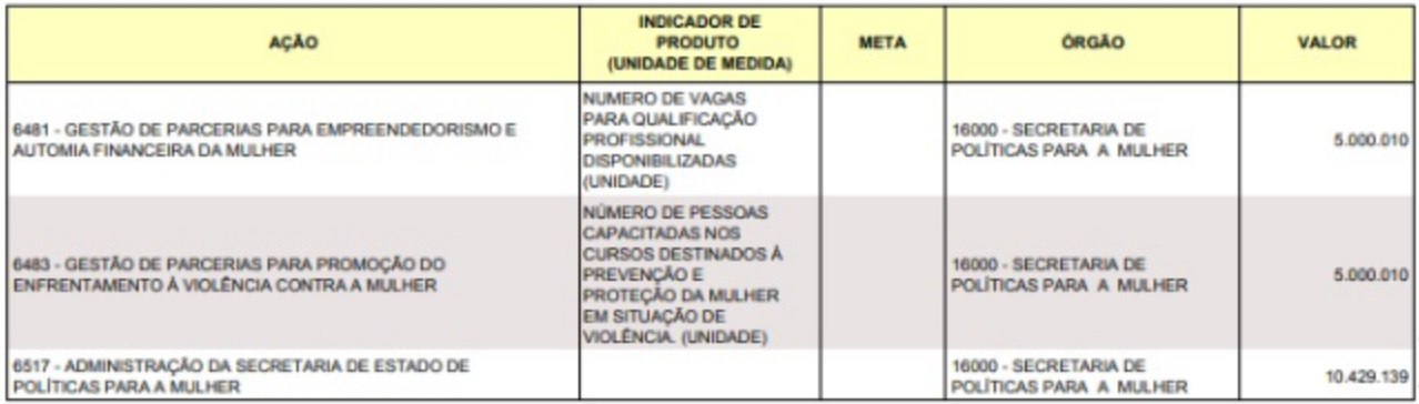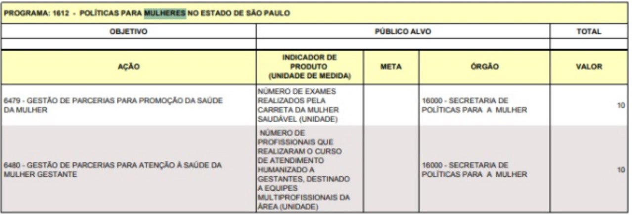 Dez reais. Esses são os valores oficialmente descritos na rubrica de despesas com promoção de saúde da mulher e saúde da gestante, aprovados na Lei Orçamentária Anual votada em 2024 que definiu os investimentos relativos à Secretaria da Mulher do governo do estado de São Paulo em 2025.