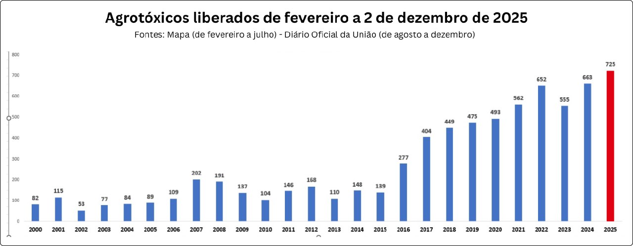 O Brasil mantém o ciclo de acelerada aprovação de agrotóxicos, que bate recordes a cada ano. Em 2025, segundo dados apurados em primeira mão pelo Brasil de Fato, foram 725 novos produtos químicos liberados pelo Ministério da Agricultura, Pecuária e Abastecimento (Mapa) até dezembro – quase 10% a mais que em 2024, o último ano recorde. Um relatório da Organização das Nações Unidas para a Alimentação e Agricultura (FAO, na sigla em inglês), com dados de 2021, considerou o Brasil o país que mais usa agrotóxicos no mundo – inclusive mais que China e Estados Unidos juntos.