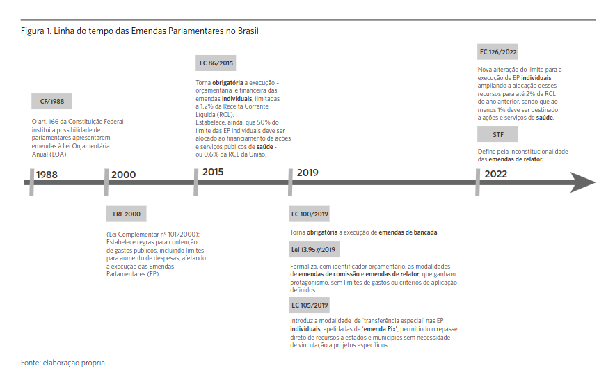 As Emendas Parlamentares (EP) estão previstas no ordenamento jurídico brasileiro desde a Constituição Federal de 1946 (CF/1946), mas a sua utilização foi cerceada no bojo da estratégia de controle e concentração do poder nacional pelos militares à frente do Executivo, no governo ditatorial militar, entre 1964 e 1985 [3]. No contexto da redemocratização, as EP voltaram a ser aceitas na comissão mista de orçamento apenas sob a forma de emendas de bancada e exclusivamente visando à anulação de despesa devida a erros ou omissões da peça apresentada pelo Poder Executivo, ou ainda por incompatibilidade com o planejamento estratégico do governo federal [4].