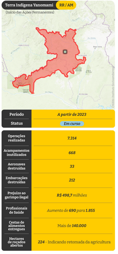 Desde 2023, o governo do presidente Lula deflagrou operações em nove territórios, protegendo, segundo dados oficiais, 58 mil indígenas em 18,7 milhões de hectares, com prejuízo estimado de R$ 740,6 milhões ao crime organizado — mais de 20 órgãos federais participaram das operações em estados como Rondônia, Pará, Maranhão, Roraima e Amazonas.