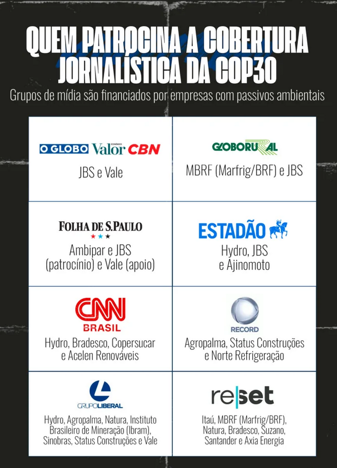 Outro destaque do relatório é o patrocínio à imprensa. Cinco das oito corporações analisadas financiaram as coberturas jornalísticas de veículos de mídia para a COP30. Cinco grandes grupos de comunicação do Brasil — Globo, Folha, Estadão, CNN e Liberal — foram contemplados com patrocínios de empresas com passivos ambientais amplamente conhecidos, levantando questionamentos sobre isenção e ética jornalística. Além do apoio direto, Itaú e Norsk Hydro financiaram treinamentos para profissionais de imprensa que irão cobrir a COP30, incluindo o patrocínio de press trips e delegações visitando projetos ambientais apoiados pelas duas empresas.