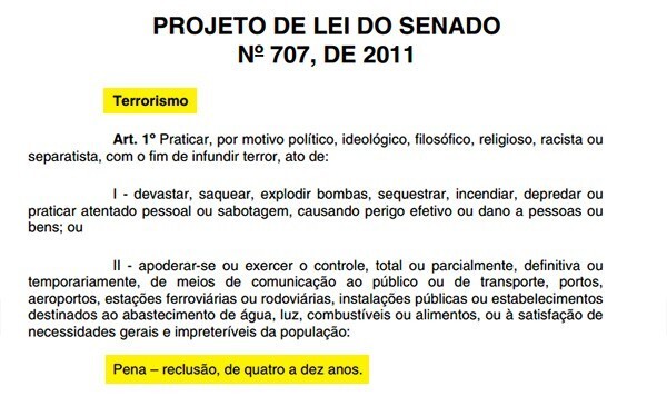 Entretanto, nas quatro comissões em que tramitou, o PL 728 recebeu pareceres desfavoráveis de três – apenas a Comissão de Educação, Cultura e Esporte (CE) o aprovou. Prevê penas de 15 a 30 anos para quem “provocar ou infundir terror ou pânico generalizado mediante ofensa à integridade física ou privação da liberdade de pessoa, por motivo ideológico, religioso, político ou de preconceito racial, étnico ou xenófobo” (em caso de morte, a pena aumenta para 24 a 30 anos). A pena aumenta um terço se praticado em estádios de futebol no dia de jogos da Copa. O PL ainda define penas para terrorismo contra coisa (8 a 20 anos), ataque a delegações (2 a 5 anos), violação de sistemas de informática (1 a 4 anos), falsificação (2 a 6 anos) e revenda ilegal de ingressos (6 meses a 2 anos) e falsificação de credencial (1 a 5 anos), dentre outros.