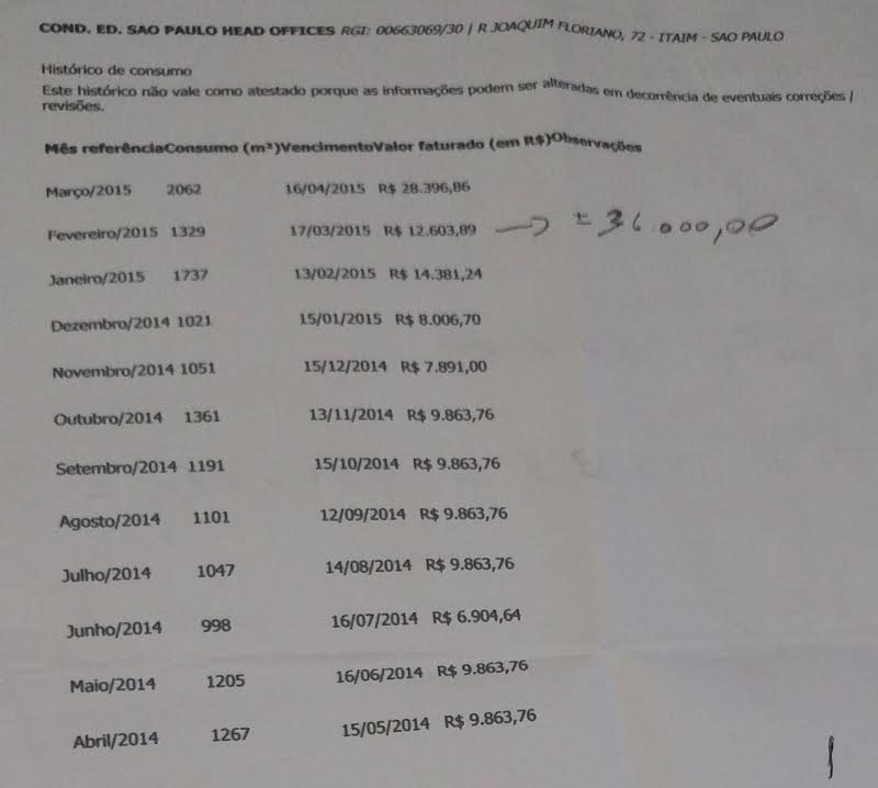 Em 17 de março de 2015, a conta de água do lugar foi de R$ 12.603,89. Eles gastaram 1329 metros cúbicos. O valor correto seria de R$ 36 mil, mais ou menos. Ou seja, o edifício comercial deixou de pagar R$ 24 mil e é assim todo mês há vários anos. O desconto existe desde 2003. Qual é o motivo para contas tão baixas?