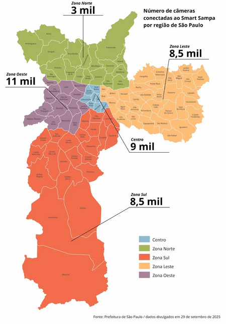 A gestão Nunes planejava atingir a marca de 40 mil câmeras conectadas ao sistema até o final do mandato, em 2028. Essa meta foi conquistada este ano e se tornou uma de suas principais bandeiras na área de segurança. A estrutura da política de vigilância impressiona por sua dimensão. Segundo o último comunicado da Prefeitura, das 40 mil câmeras instaladas em toda a capital, a maioria na Zona Oeste e no Centro — com 11 mil e 9 mil aparelhos, respectivamente.