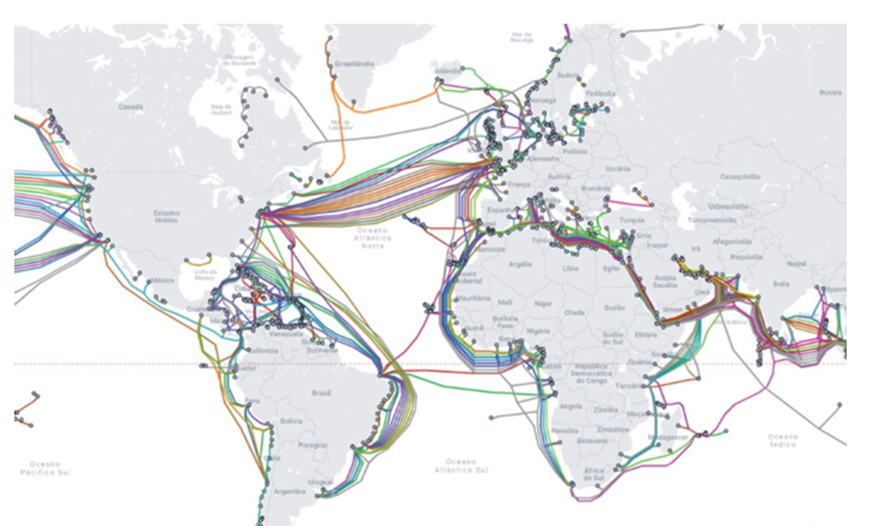 Entre os cabos submarinos que conectam o Brasil ao restante do mundo, destacam-se o AMX-1, o BRUSA, o Monet e o EllaLink, todos com presença estratégica em Fortaleza. Outros pontos de ancoragem relevantes incluem Santos (SP), Rio de Janeiro (RJ) e Porto Alegre (RS), compondo uma rede que estrutura a circulação global de dados e orienta a disputa territorial entre grandes empresas de tecnologia e telecomunicações. A proximidade entre data centers e estações de aterramento de cabos reduz custos operacionais, minimiza perdas de transmissão e aumenta a competitividade das corporações, reforçando a importância geopolítica desses territórios.