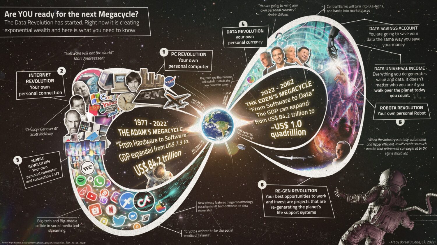 Na visão trazida por Vellozo e Brett King, futurista australiano, autor de livros como “Bank 4.0” e “Augmented” e cofundador do Moven, o primeiro neobanco móvel dos EUA – tendo também atuado como consultor do governo Obama sobre o futuro do setor bancário, e sido citado pelo presidente Xi Jinping –, estamos no fim de um “megaciclo econômico” correspondente ao período “1977–2022: do hardware ao software”. O próximo megaciclo, de 2022 a 2062, seria o ciclo “do software aos dados”.