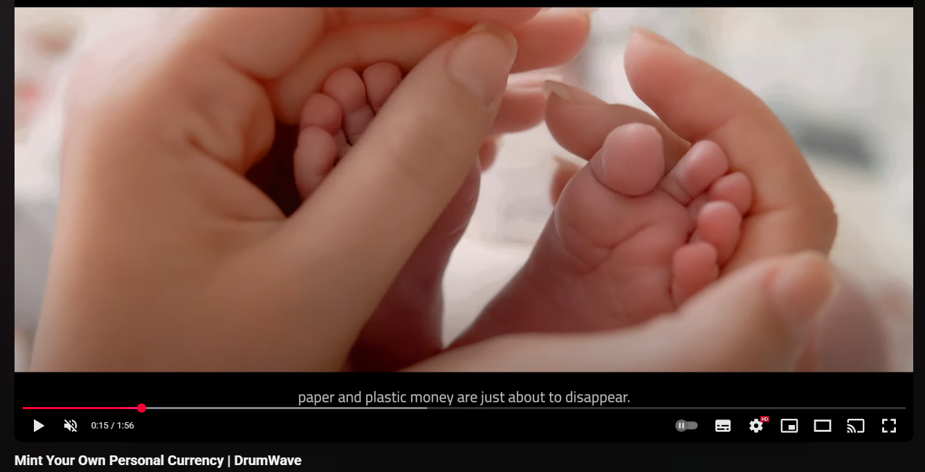 Imagem: captura de tela/YouTube, publicidade “Crie sua própria moeda”, DrumWave (2022), cuja premissa central é que a liberdade máxima é alcançada quando toda experiência humana – começando pelo nascimento – é transformada em dados transacionáveis, tornando o próprio sujeito uma plataforma de negócios.