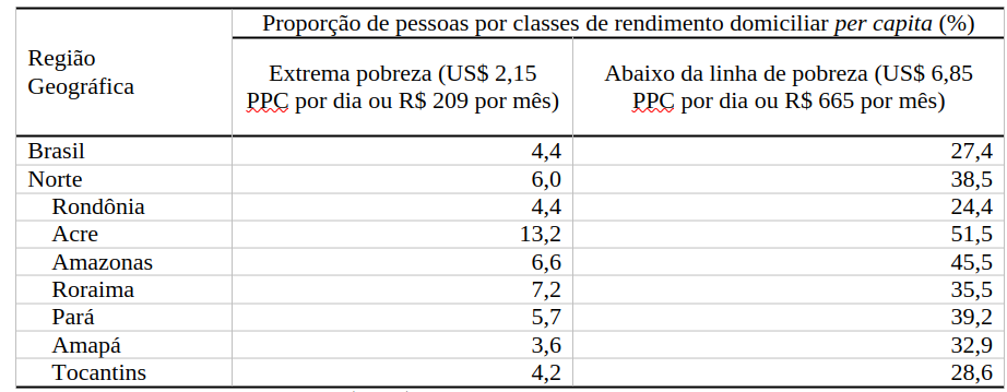 A precariedade dos indicadores socioeconômicos não fica restrita ao saneamento. Em 2023, a região Norte apresentou uma das maiores taxas de pobreza e extrema pobreza do país, ficando atrás apenas do Nordeste. Nesse ano, 38,5% da população encontrava-se abaixo da linha de pobreza e 6,0% vivia em situação de extrema pobreza, percentuais superiores à média nacional. Entre os estados nortistas, o Acre registrou os piores indicadores, com 51,5% da população abaixo da linha de pobreza e 13,2% em extrema pobreza. Esse é um reflexo do modelo de desenvolvimento adotado para a região e das políticas desconectadas da realidade local, as quais, na maioria das vezes, são do tipo top-down, pensadas por organismos multilaterais e agências internacionais de fomento que desconhecem as reais necessidades da população, agravando, assim, o quadro de vulnerabilidade social.