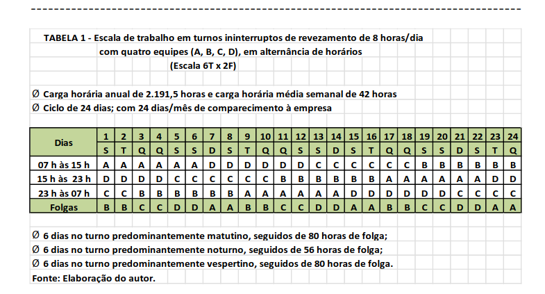 Um arranjo comum, até 1988, era a organização do trabalho em três turnos de oito horas cada, por exemplo, de 07h às 15h (turno predominantemente matutino); de 15h às 23h (predominantemente vespertino); e de 23 h às 07 h (predominantemente noturno), numa escala de seis dias de trabalho por dois dias de folga (“Escala 6T x 2F”), com alternância de horários entre as quatro equipes. Nesse caso, para cada equipe, após seis dias consecutivos de trabalho no primeiro turno, sucedia-se uma folga de 80h; na sequência, após seis dias de trabalho no terceiro turno, seguia-se uma folga de 56h; e finalmente, após seis dias de trabalho no segundo turno, outra folga de 56h, completando o ciclo de 24 dias. Nessa escala, cada equipe comparecia à empresa 24 dias por mês (Tabela 1, a seguir).