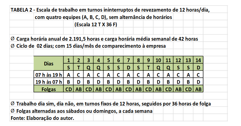 No Brasil, a “Escala 12h x 36h” é comum em hospitais, em serviços de vigilância e em condomínios residenciais, malgrado seus impactos negativos sobre a saúde e a segurança no trabalho e para o convívio familiar e social especialmente para quem o exerce no período predominantemente noturno (Tabela 2).