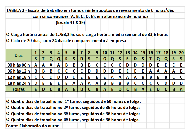 A adoção da jornada de seis horas, em uma empresa que funciona 24 horas por dia, implica a contratação de uma quinta equipe de trabalho em revezamento. A Tabela 3 apresenta uma das escalas possíveis, de seis horas/dia, com cinco equipes: