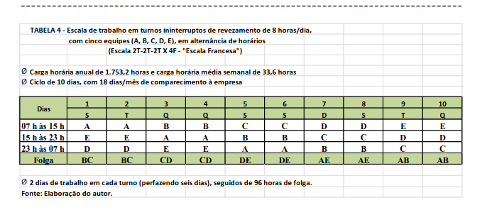 Por esses motivos, a chamada “Escala Francesa” tornou-se uma das preferidas pelos/as trabalhadores/as em turnos de revezamento com alternância de horários, com cinco equipes. Nela, o trabalho é realizado em turnos de oito horas durante seis dias, sendo dois dias em cada turno, seguidos de 96 horas de folga, como mostra a Tabela 4, a seguir.