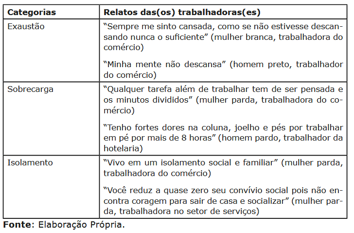 Para a análise das respostas à pergunta aberta, os dados foram sistematizados em três categorias que caracterizam a rotina na escala: a exaustão física e mental, relatada no extremo cansaço e na irritabilidade; a sobrecarga física e mental, exposta nos relatos como a constante administração do pouco tempo fora do trabalho e da sobrecarga do corpo pelas horas de trabalho; e o isolamento, com o estreitamento afetivo e de horizonte, em relatos que indicam desânimo e impossibilidade de planejar o futuro. Essas categorias se entrelaçam no relato de uma trabalhadora do comércio, mulher preta, que afirma: “vivo apenas para trabalhar”. O Quadro 1 busca classificar os relatos das(os) trabalhadoras(es) nessas categorias: