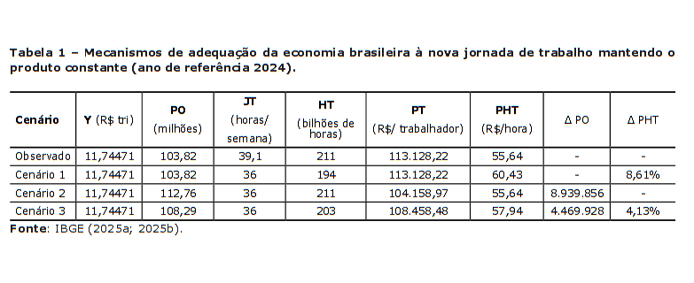 Para demonstrar como há outras formas de simular o impacto da mudança na jornada de trabalho, os cálculos foram baseados na metodologia aplicada em Duque (2025) e em Barbosa Filho (2025) – mas chegam a resultados bem diferentes. O exercício proposto acrescenta, às estimativas já realizadas, cenários em que o produto é mantido constante, e variam a produtividade/hora do trabalho e/ou a ocupação. Argumenta-se que, havendo capacidade produtiva suficiente, o nível de atividade econômica tenderá a seguir a demanda agregada, se mantendo o mais próximo possível do patamar anterior às mudanças na jornada, pois a manutenção da produção é de amplo interesse dos detentores dos fatores de produção. Também é realizada uma estimativa considerando diferentes mecanismos de adaptação para cada setor da economia.
