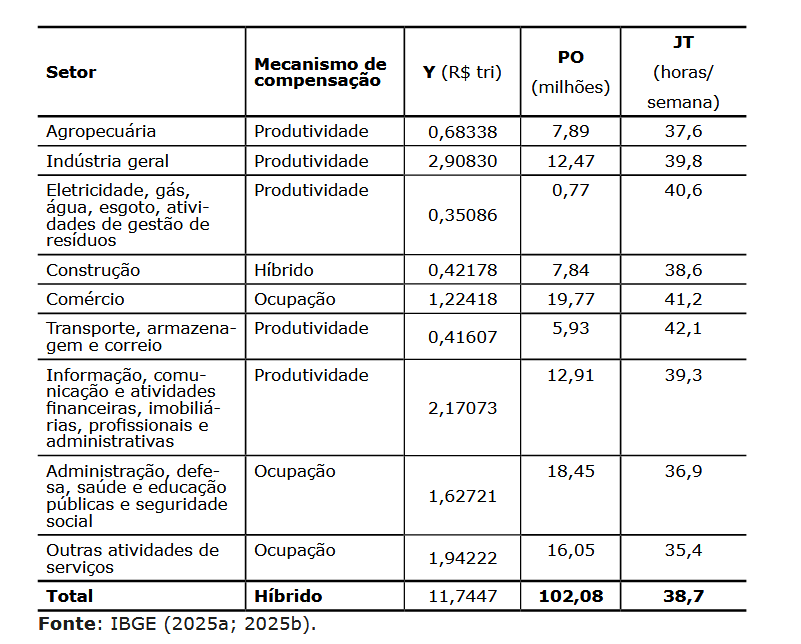 Os dados referentes ao produto setorial e agregado de 2024 foram extraídos do Sistema de Contas Nacionais (SCN/IBGE), e as informações de população ocupada e jornada de trabalho são da PNADc Anual, também referentes ao ano de 2024. A correspondência setorial entre os dados das Contas Nacionais e da PNADc é descrita no Anexo I.
