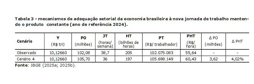 [iii] Aqui, é preciso alertar para uma falha no raciocínio aplicado neste estudo e nos estudos a que ele responde: é extremamente improvável que a legislação sobre redução da jornada de trabalho seja aplicada a todos os trabalhadores. Mesmo que uma parte do setor informal diminua a duração da jornada, é pouco razoável supor que todos os trabalhadores informais terão respeitado seu direito a uma jornada de 36 horas semanais. No quarto trimestre de 2024, a taxa de informalidade ampla, calculada pelo CESIT, apontava para 48,36% da população ocupada na informalidade. No entanto, a dificuldade metodológica para separar a parcela do produto total que pode ser atribuída ao trabalho formal e informal leva o exercício a essa aproximação, que precisa ser considerada exatamente assim: como uma aproximação, cujo objetivo é desenhar situações de máximos e mínimos, mas ciente de que a realidade se localiza em algum lugar entre estes dois pontos.